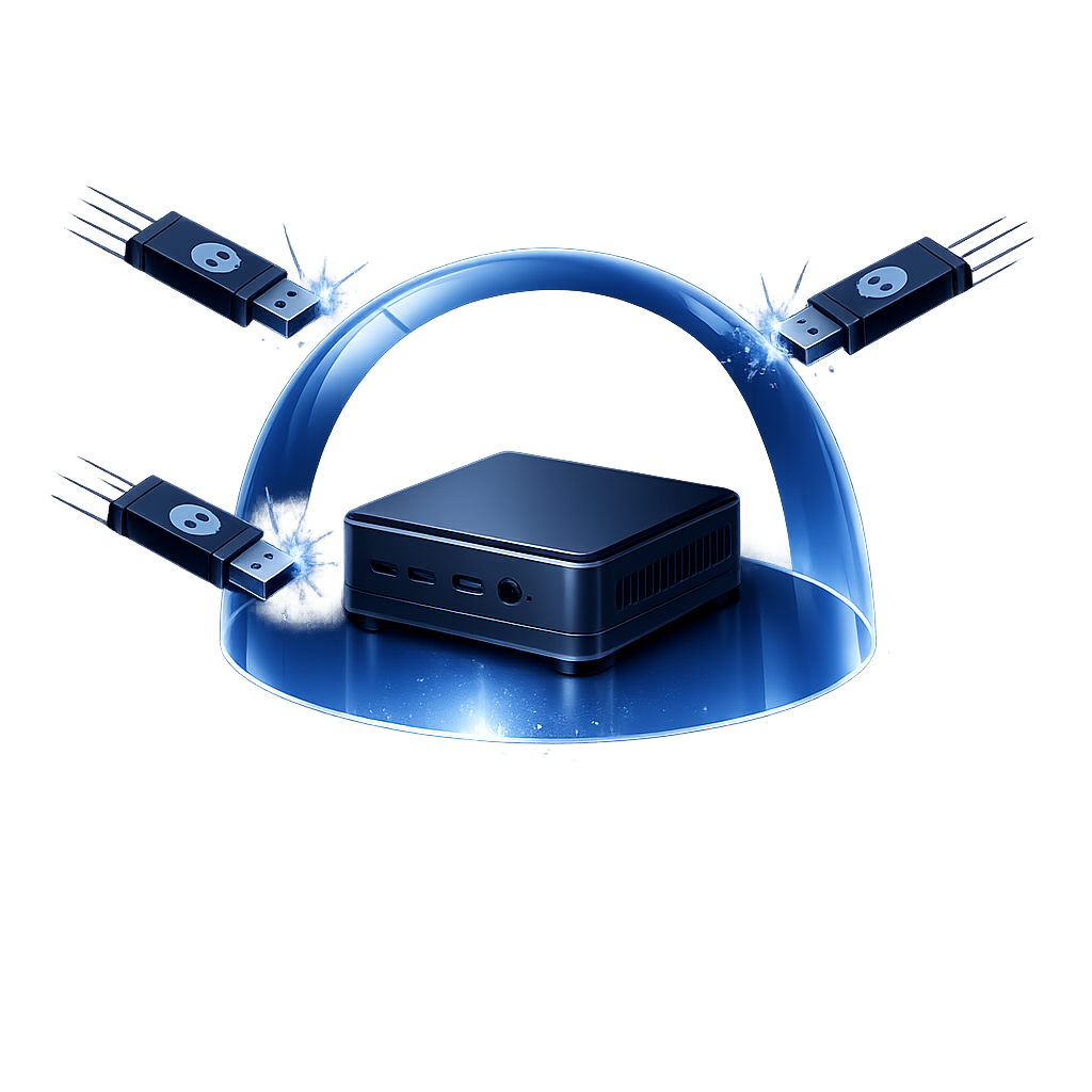Multiple layers of self-protection against tampering, including BadUSB attack prevention. Only mass-storage devices are accepted — keyboard and HID emulation attacks are blocked at the hardware level.